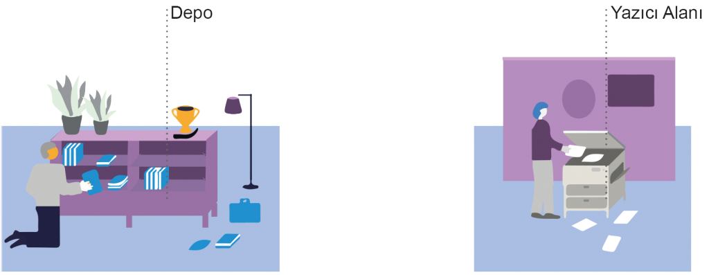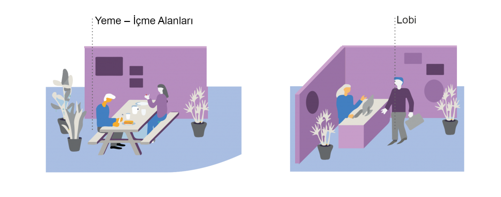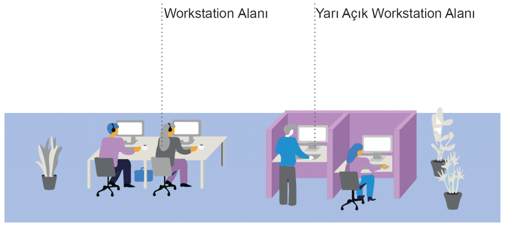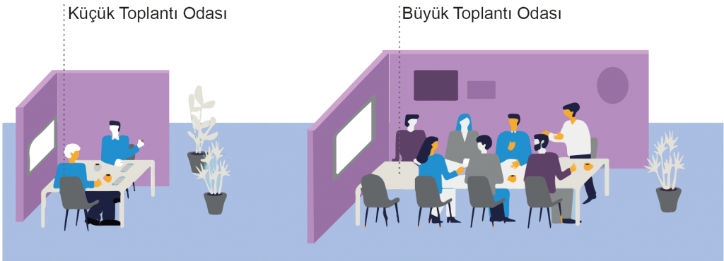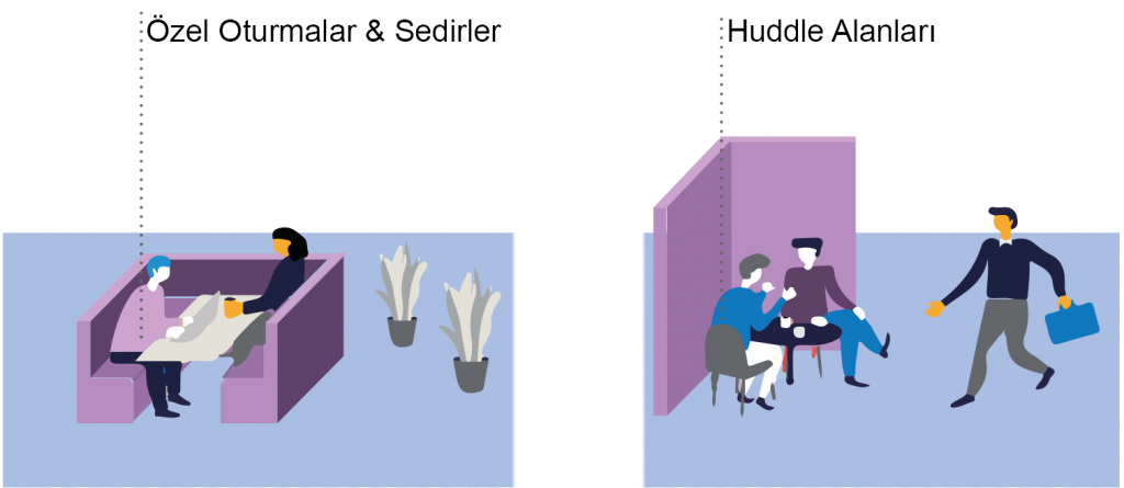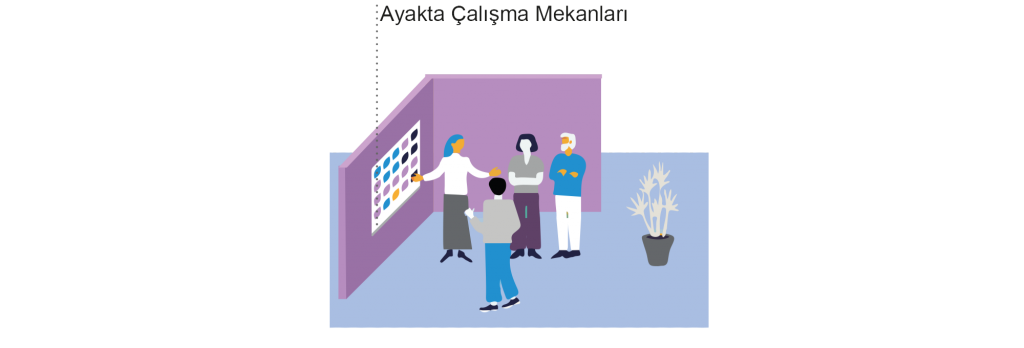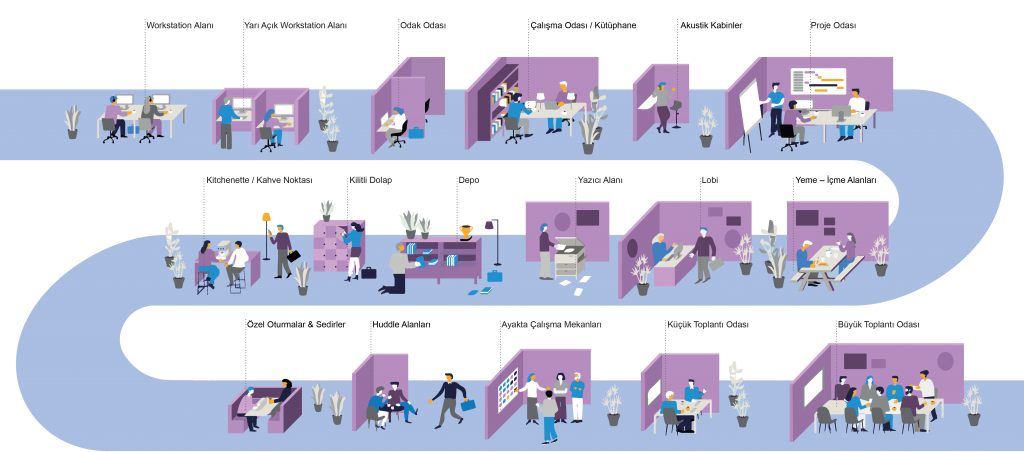 Çalışma alanları, yukarıdaki faaliyetler için farklı türlerde alanlar/odalar sunmalı ve bu alanlar, çalışma modlarının farklı ihtiyaçlarını karşılamalıdır.
