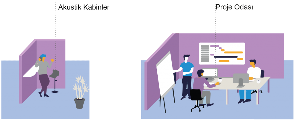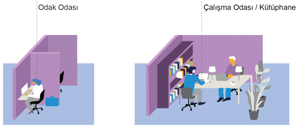 Odaklanma: Yoğun çalışma, sessiz alanlar ve bire bir tartışmalar için kullanılan atanmamış yarı özel odalar. Kullanım için kolay erişilebilir yerlerde bulunur. Dikkat dağıtıcı etkiler aza indirilir.