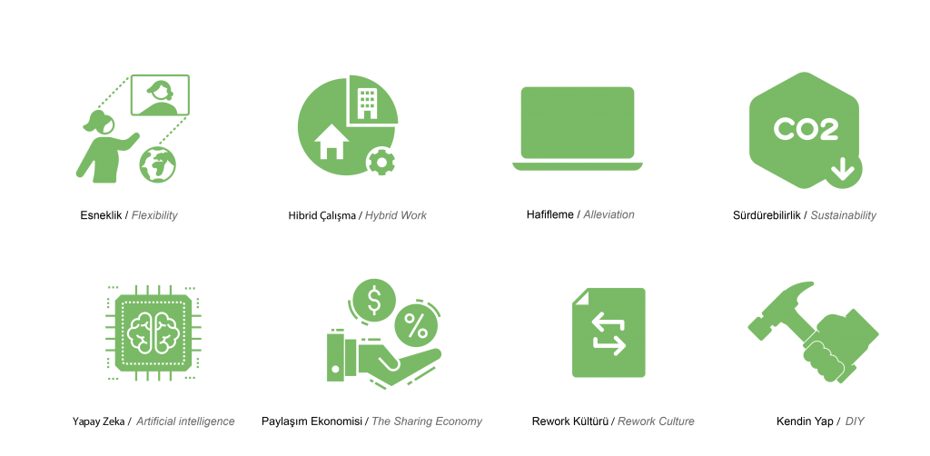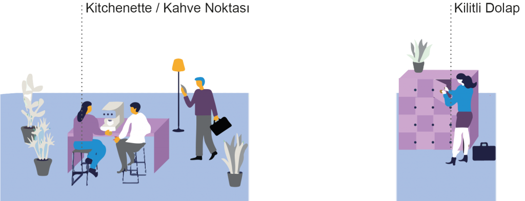 Sosyalleşmek: Çalışanların birbirleriyle gayri resmi olarak etkileşimde bulunmaları ve sosyal bağlar kurmaları için gerekli olan moddur. Kahve köşeleri, sosyal alanlar ve mola odaları gibi mekanlardır.
